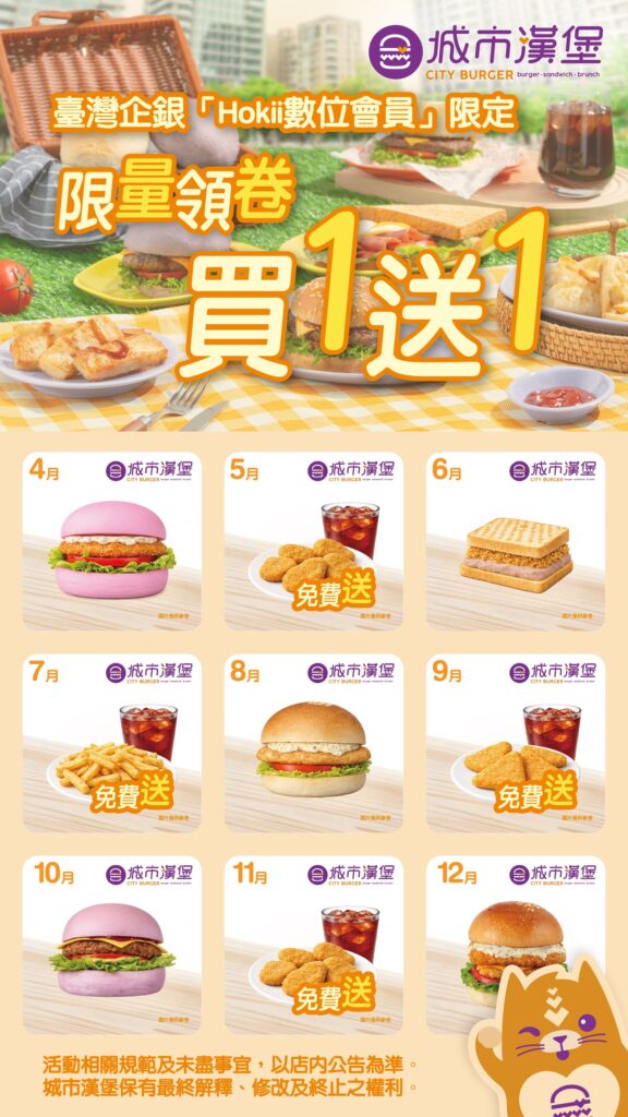 臺灣企銀Hokii數位會員合作活動城市漢堡 每月限量餐點電子票券
